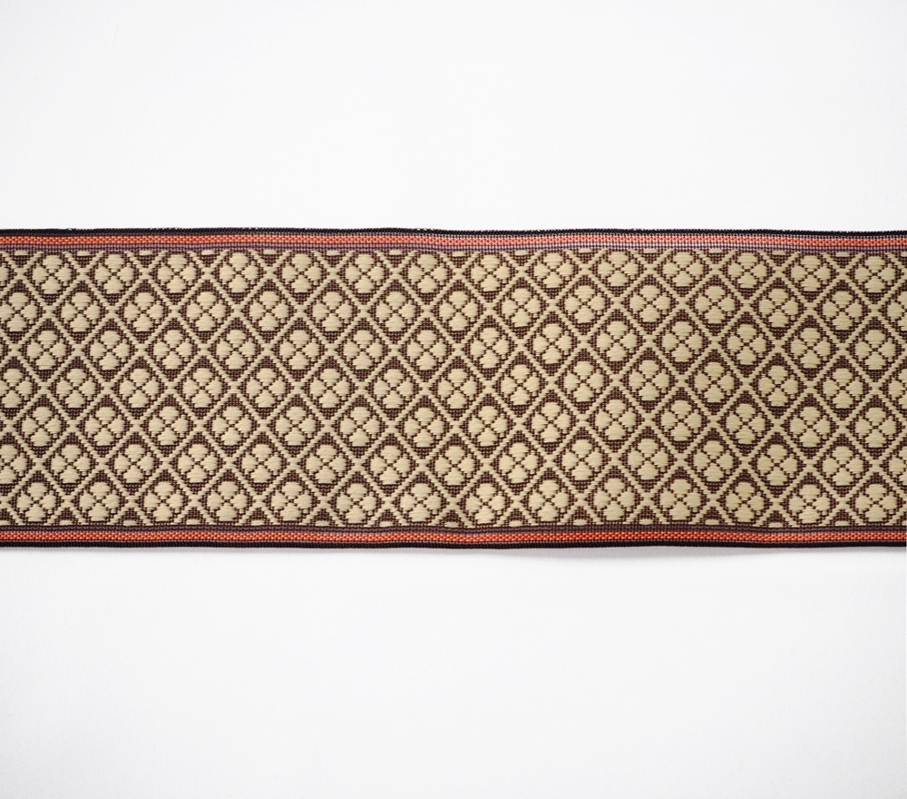 しっとりとした日本の色。艶出し加工綿糸を使用することでわびさびに通じる日本の心を色に表しました。楝色(おうちいろ)。自社工場の機織り機で、熟練の職人が丁寧に丹精を込めてつくった畳縁(たたみべり)。児島の地からお届けします。