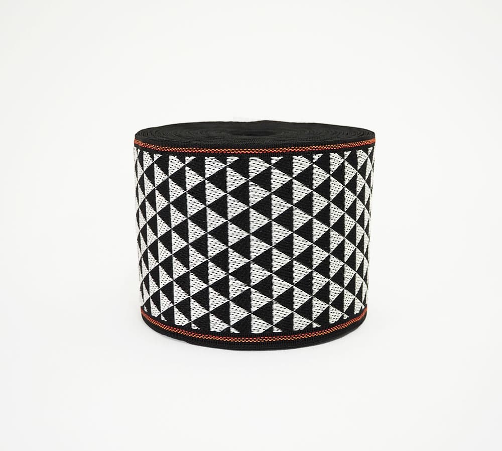 伝統的な和文様のひとつの「三角鱗」。三角形を上下左右に連続した文様。モノクロのかわいい配色。自社工場の機織り機で、熟練の職人が丁寧に丹精を込めてつくった畳縁(たたみべり)。児島の地からお届けします。