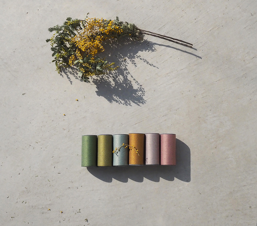 春色デニムシリーズの畳縁1.5mをセットにしました。春にそっと寄り添うような柔らかな色味と裏面はデニムカラー。色あそびのように組み合わせるのもおすすめ。