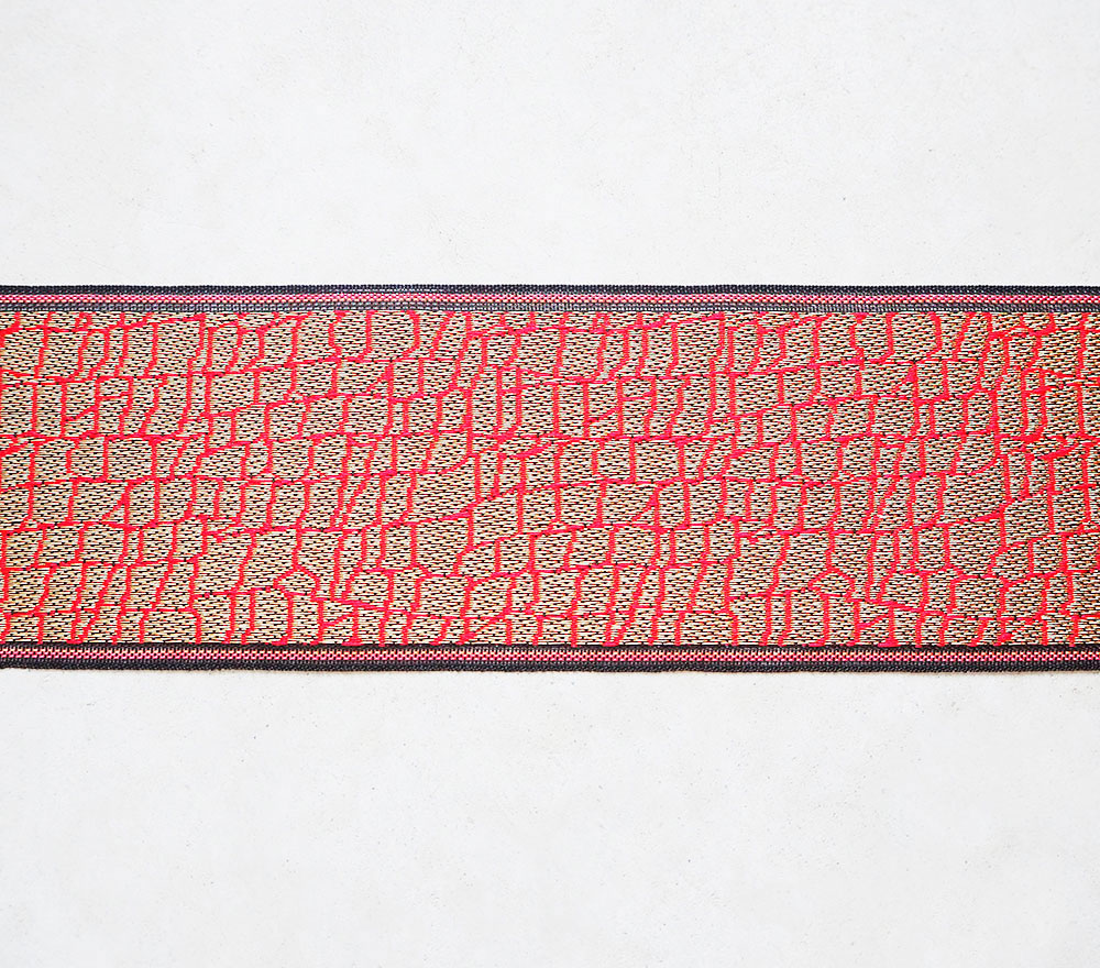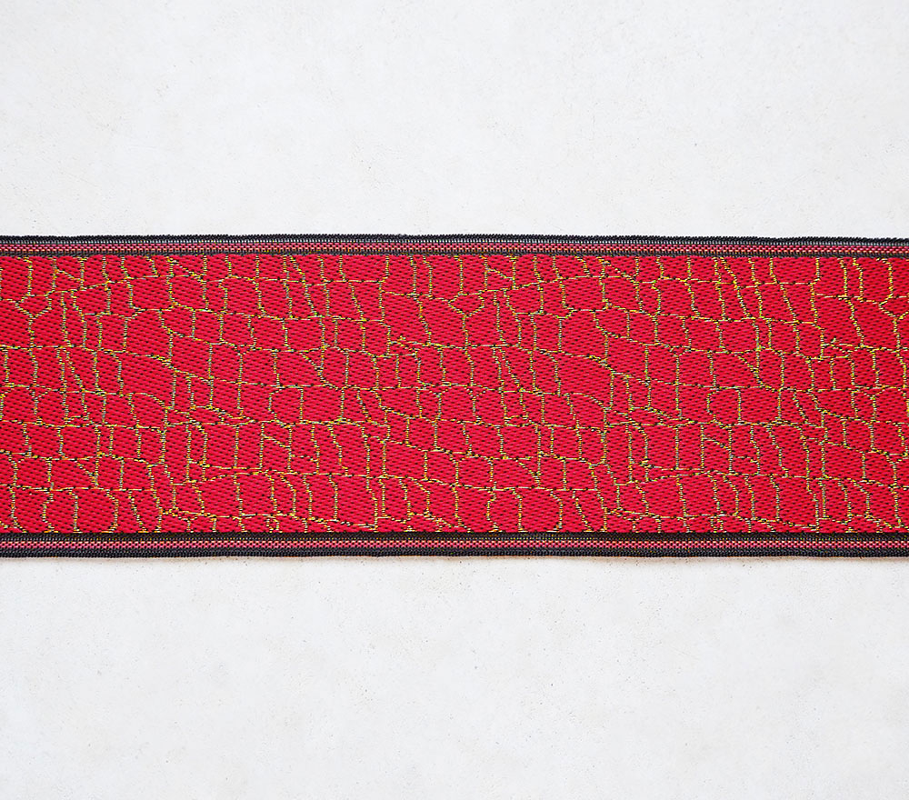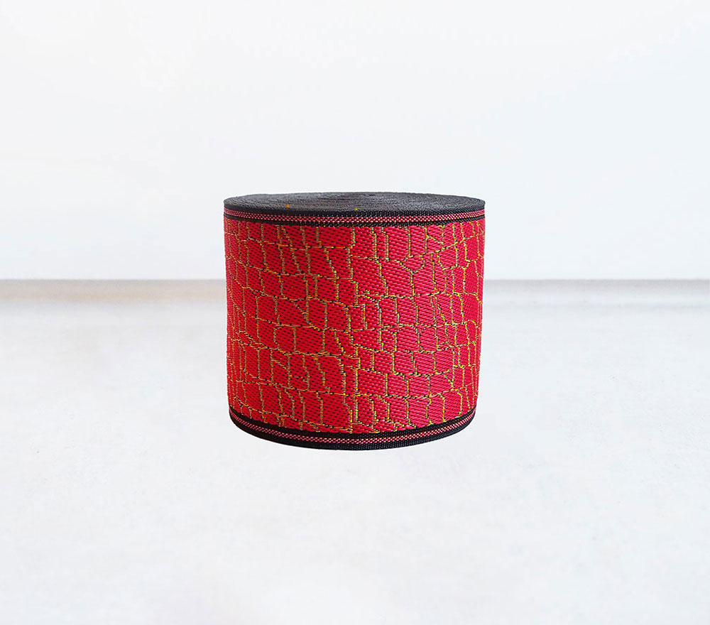 レンガを積み上げた風景を織物で表現しました。織物ならではの風合いとレンガの温かみがよく合います。赤とゴールドの煌びやかな配色。