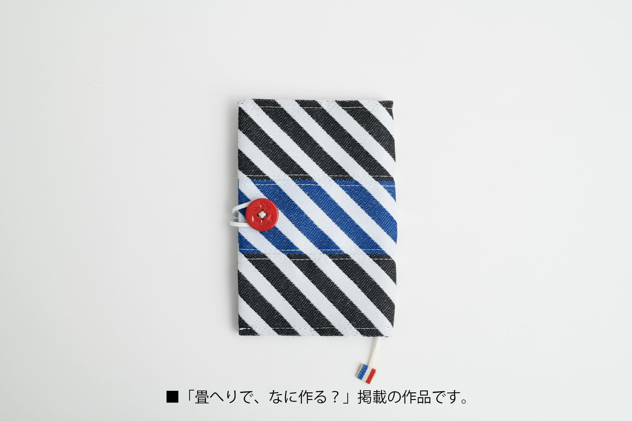 「畳へりでなに作る?かわいい&楽しすぎる”畳へり”のハンドメイドアイディア集」掲載の【バッグデザイナー】赤峰清香さんデザインの畳縁です。白地にぱきっと映えるアウトライプ柄。